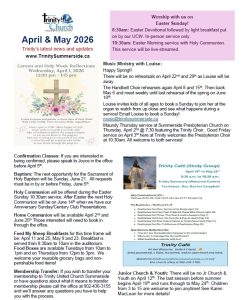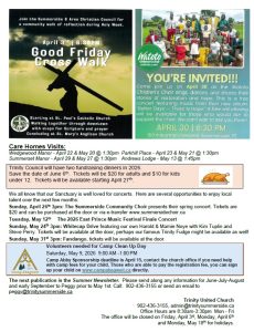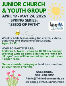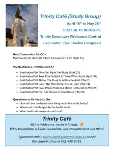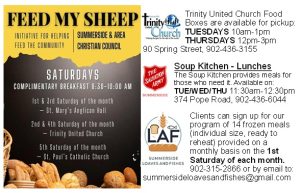 Trinity United Church is pleased to support our Food Boxes program on Tuesdays and Thursdays. We are also a member of the Feed My Sheep Breakfast program together with St Mary’s and St Paul’s.